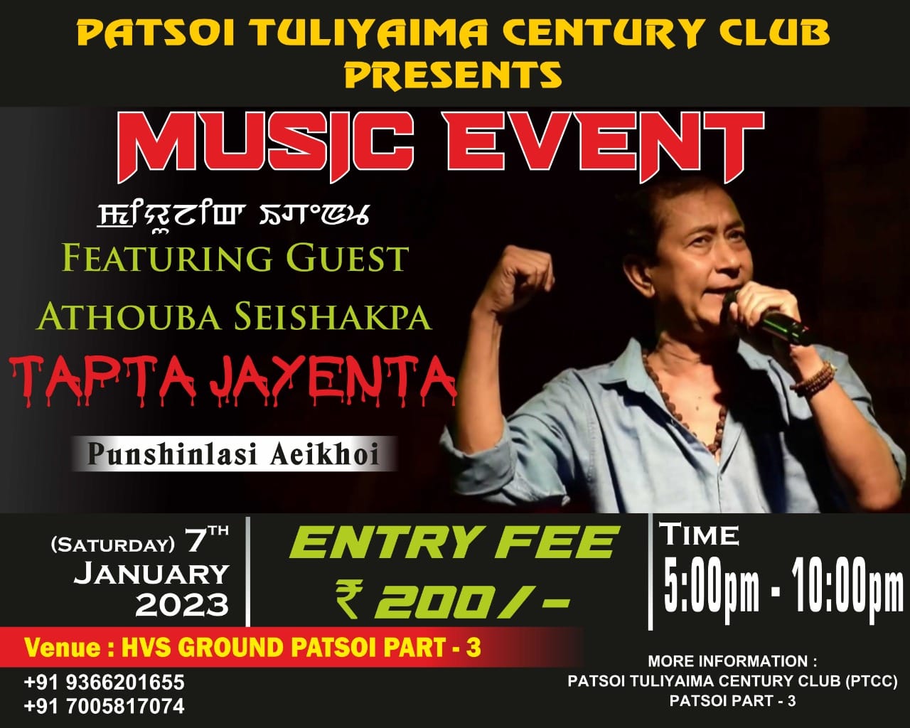 Patsoi Tuliyaima Century Club Present Music Event HVS Ground Patsoi Part 3 Tapta Jayenta Punshinlasi Aeikhoi 7 January 2023 More info: Patsoi Tuliyaima Century Club (PTCC), Patsoi Part 3 9366201655 7005817074